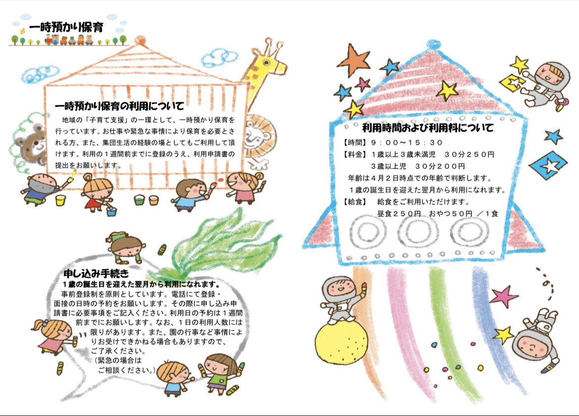10月の一時預かりは全て予約が埋まりました。 元気に登園してくださるのをお待ちしております。 電話がつながりにくく、予約が取りづらい状況になっており、申し訳ありません。 受付時間は8:30〜17:00です。 それより早いお電話には対応できませんのでご了承ください。 |